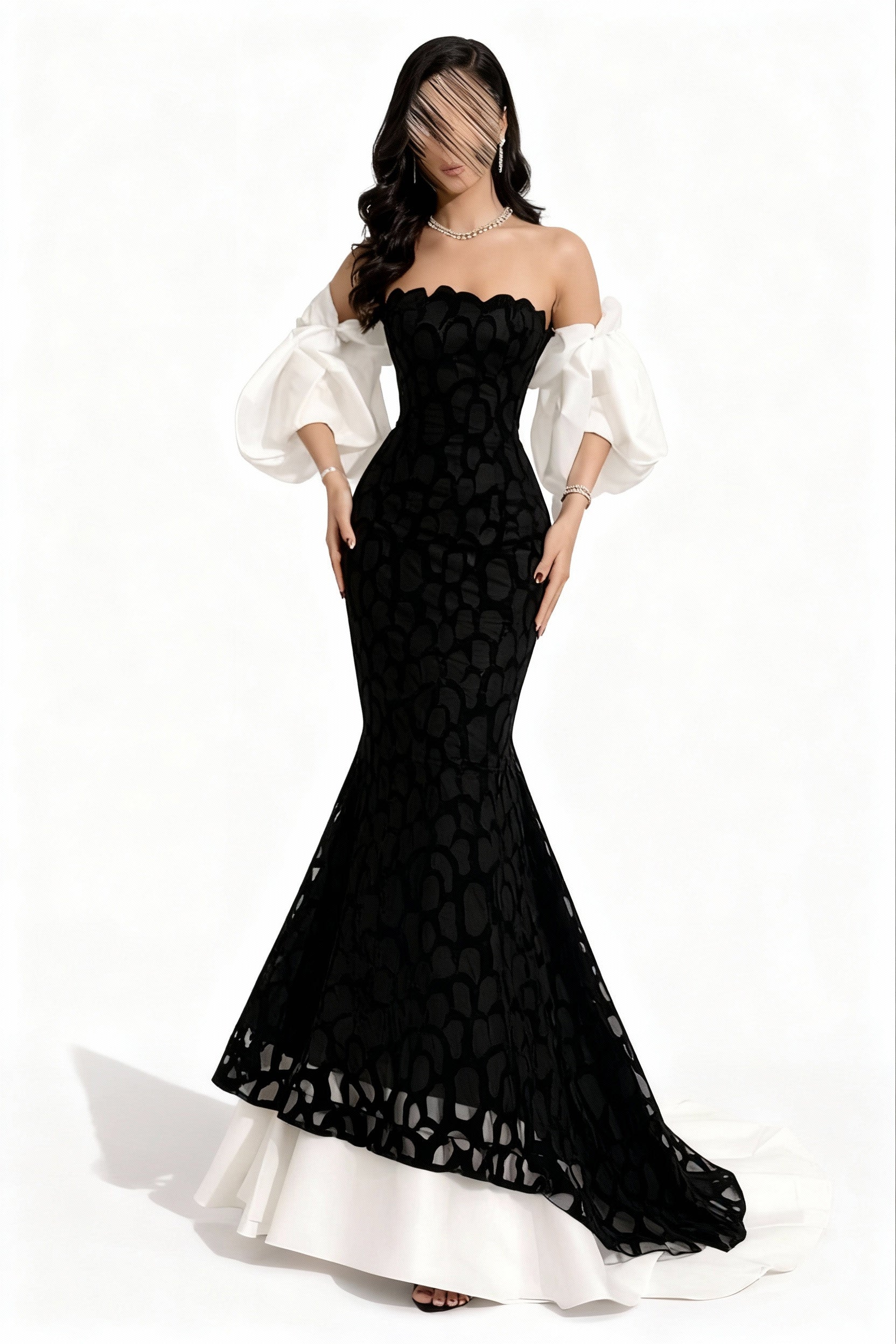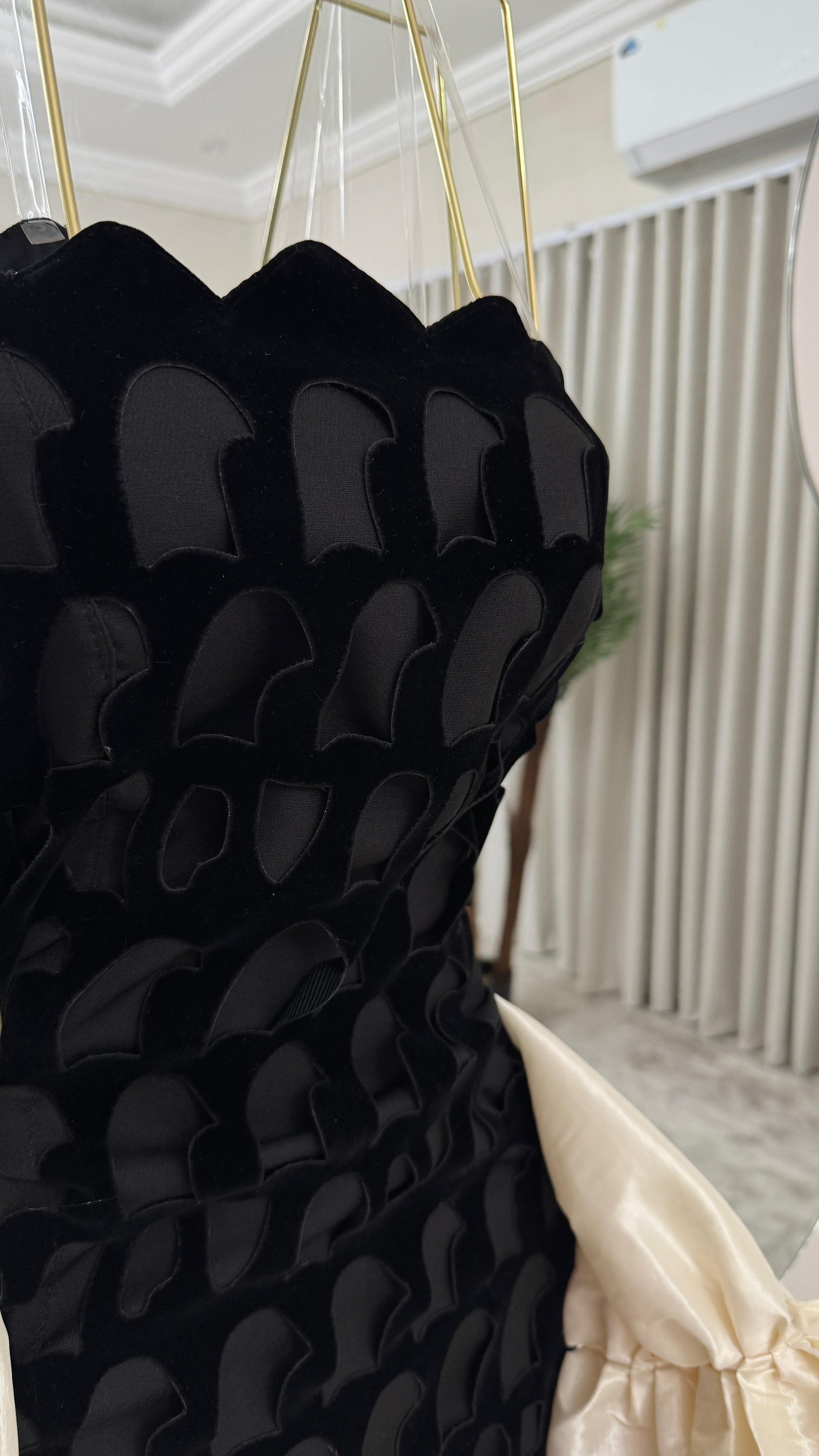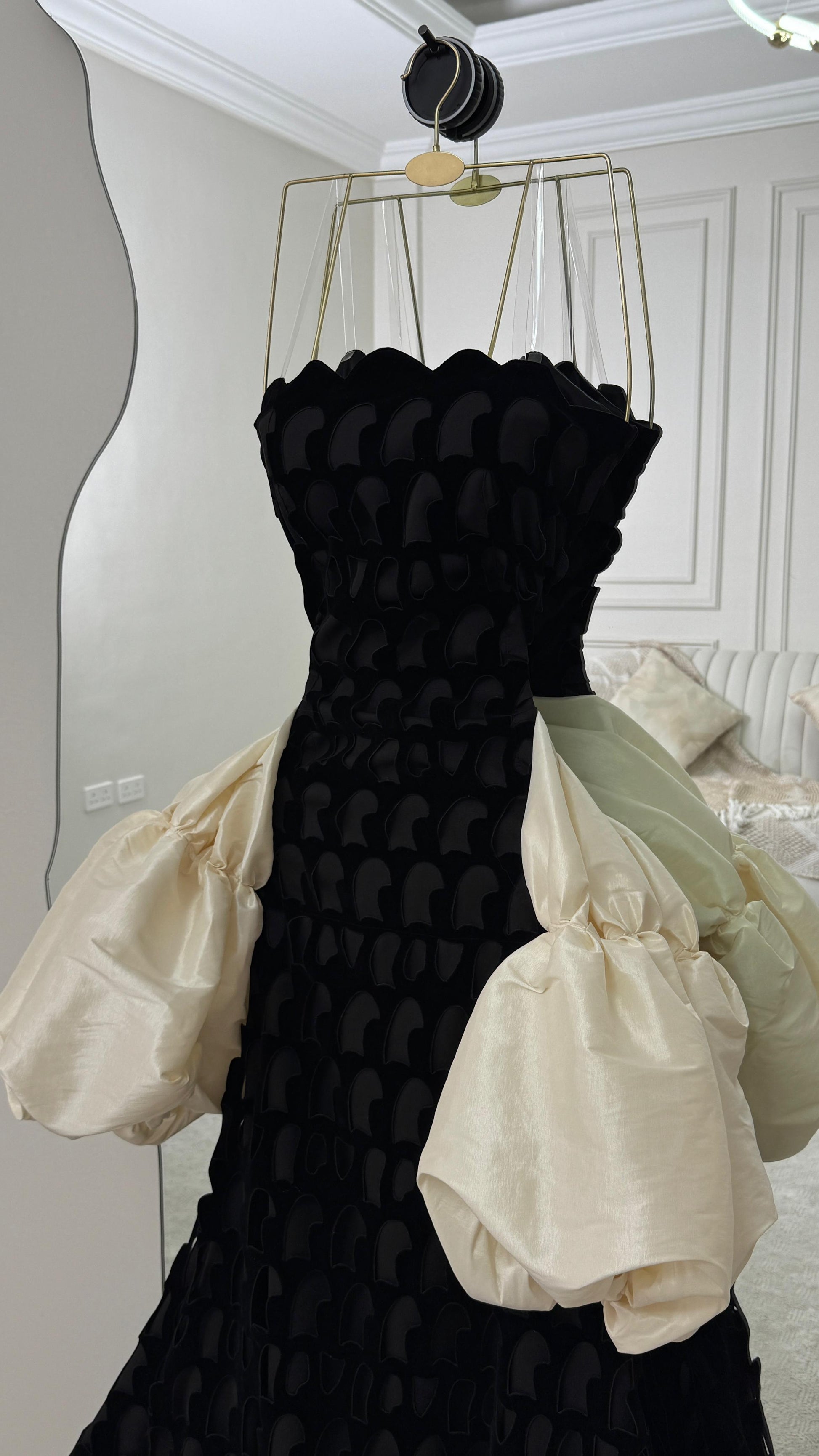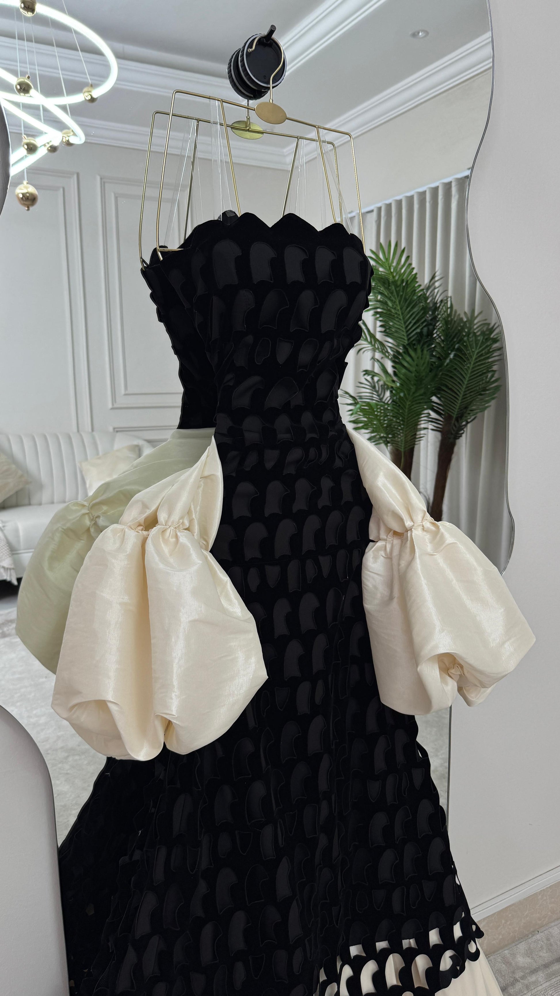 اجعلي إطلالتك مميزة وأنيقة مع هذا الفستان الأسود والأبيض الفاخر. يجمع بين الأسلوب الجريء واللمسات الرومانسية، مما يجعله الخيار المثالي للمناسبات الراقية.