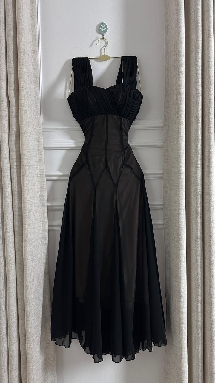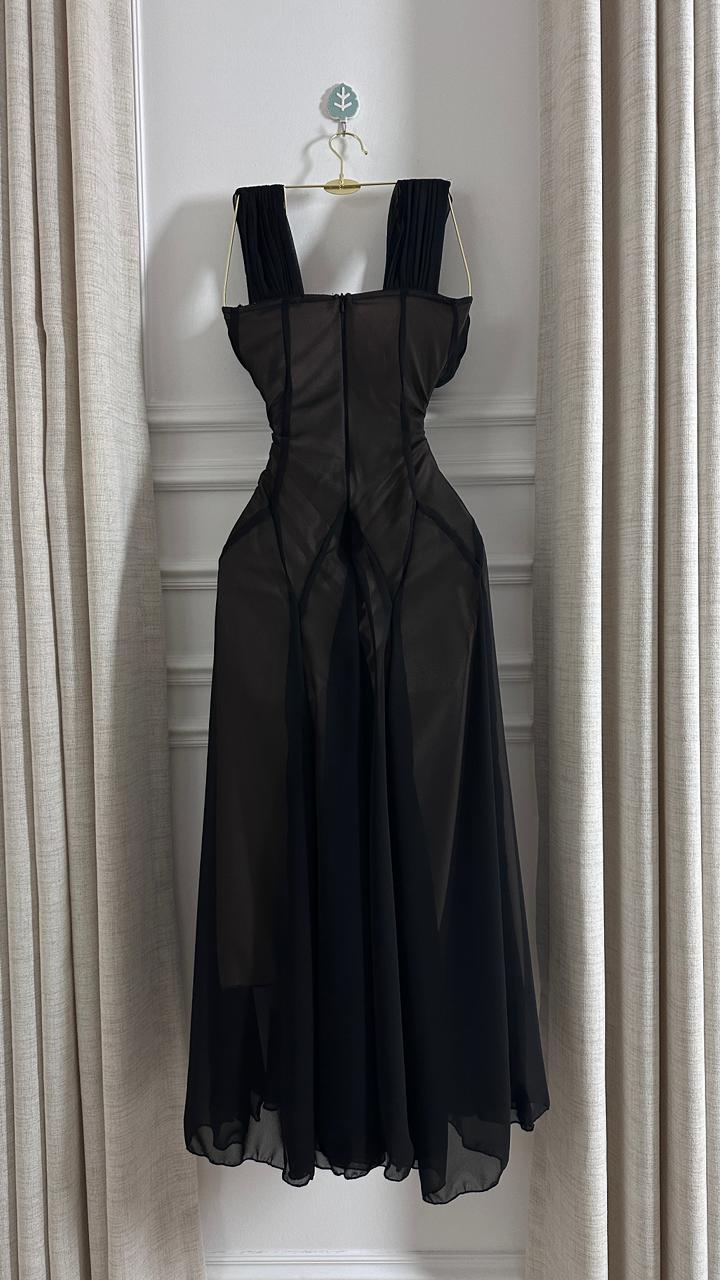 - **خامة شفافة وجرئية**: تمنح الفستان لمسة من الغموض والسحر.