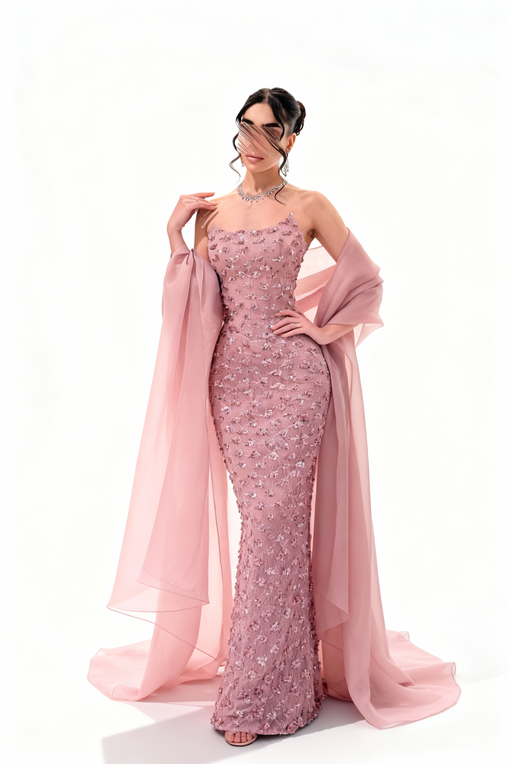 - **الشال:** يتضمن الفستان شالًا أو غطاءًا يتدلى برفق على الأكتاف، مما يعزز من أناقته ويُضفي شعورًا بالثقة.