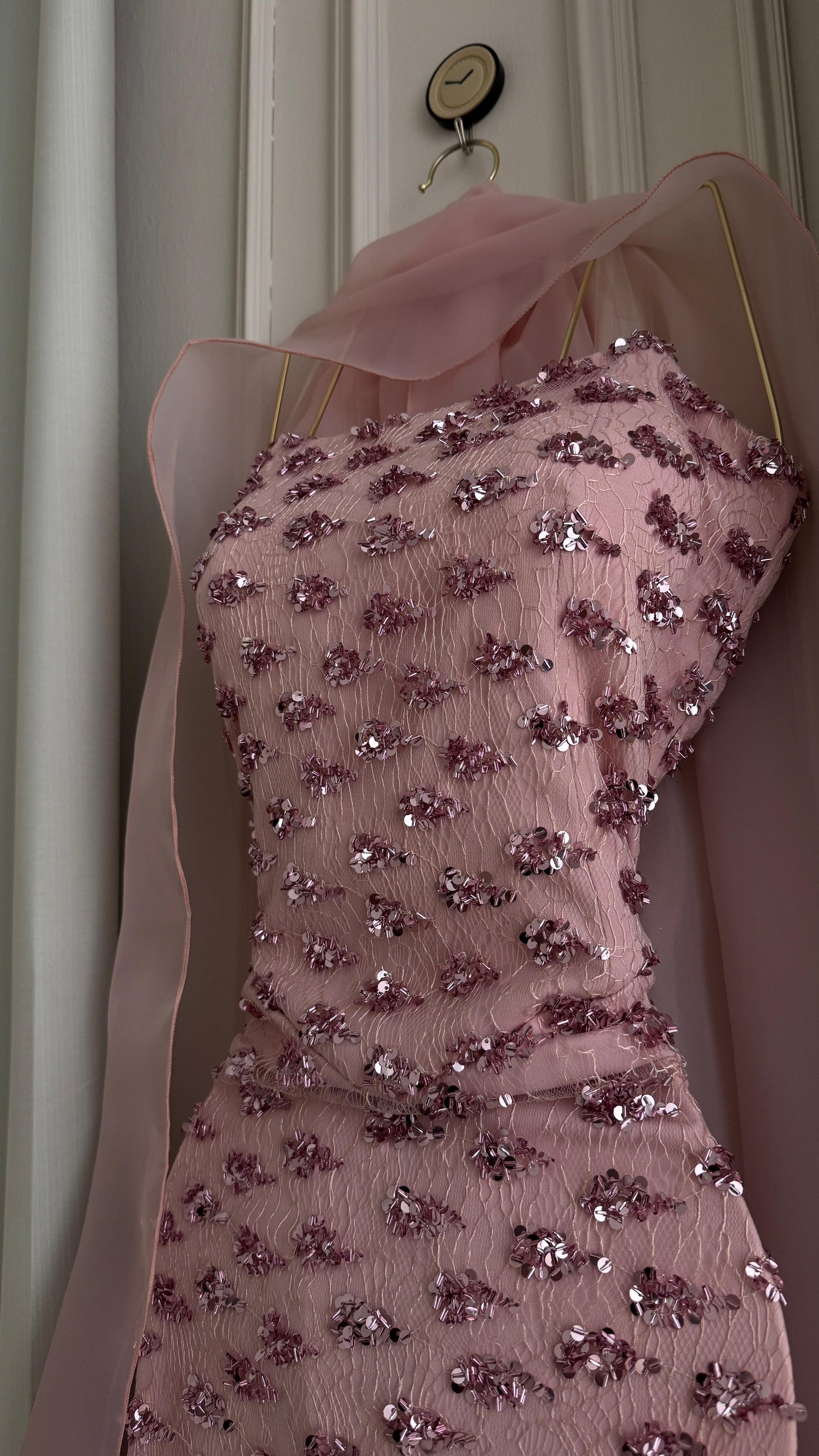 هذا الفستان المذهل يأتي بلون اللافندر الناعم، مما يجعله خيارًا مثاليًا للمناسبات الخاصة. تم تصميمه بمهارة تمنحك حركة رائعة وأناقة مذهلة. القماش الغني مزين بتفاصيل براقة تتلألأ تحت الأضواء، مما يضيف لمسة من السحر.