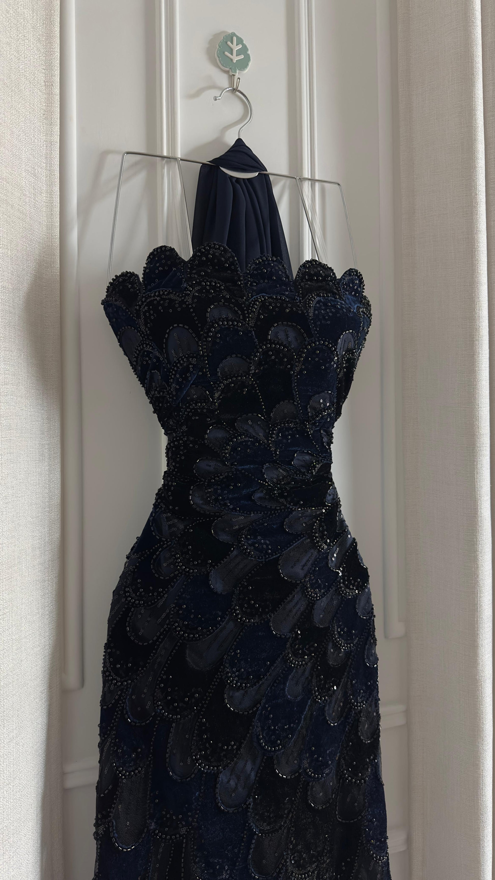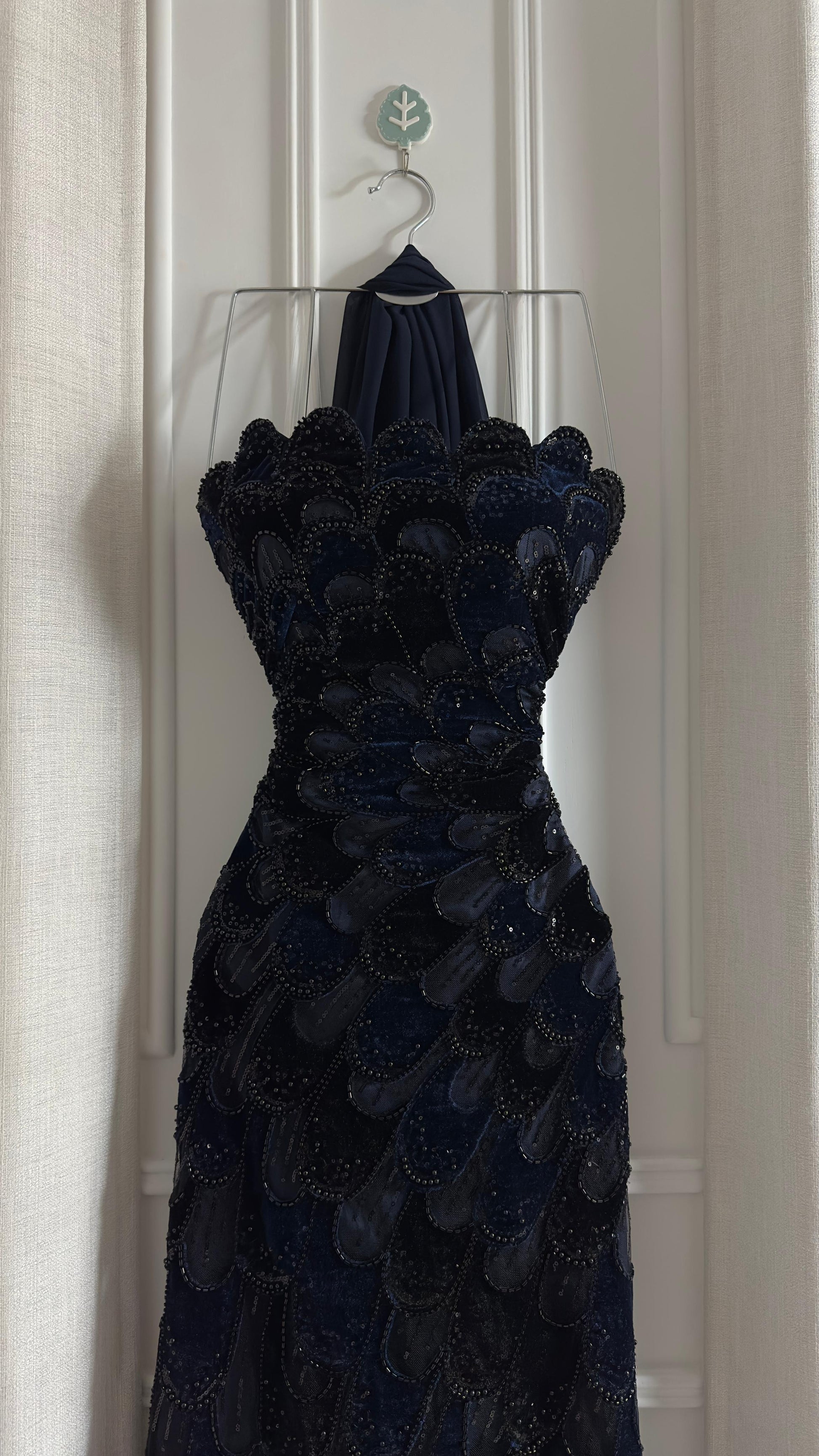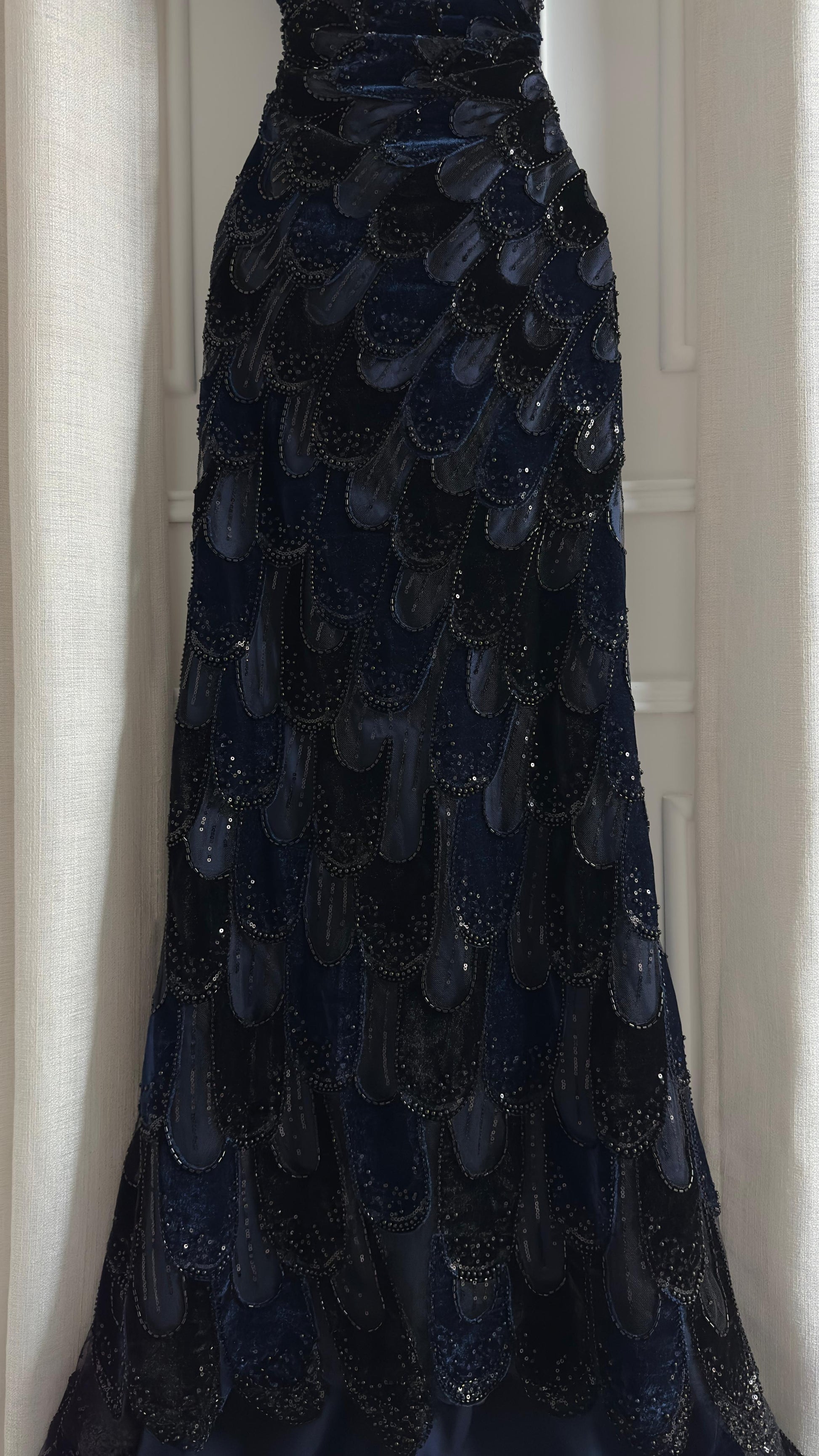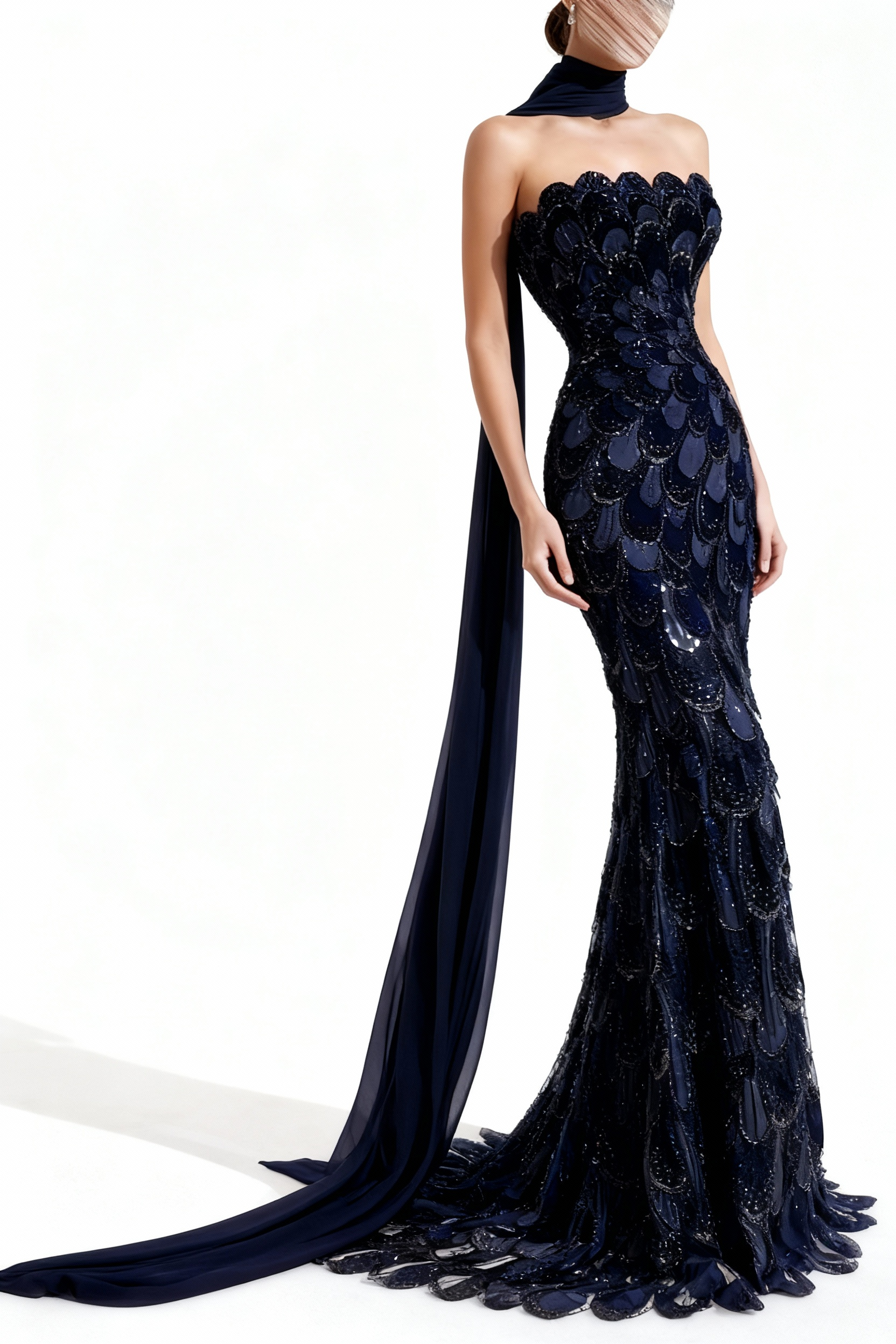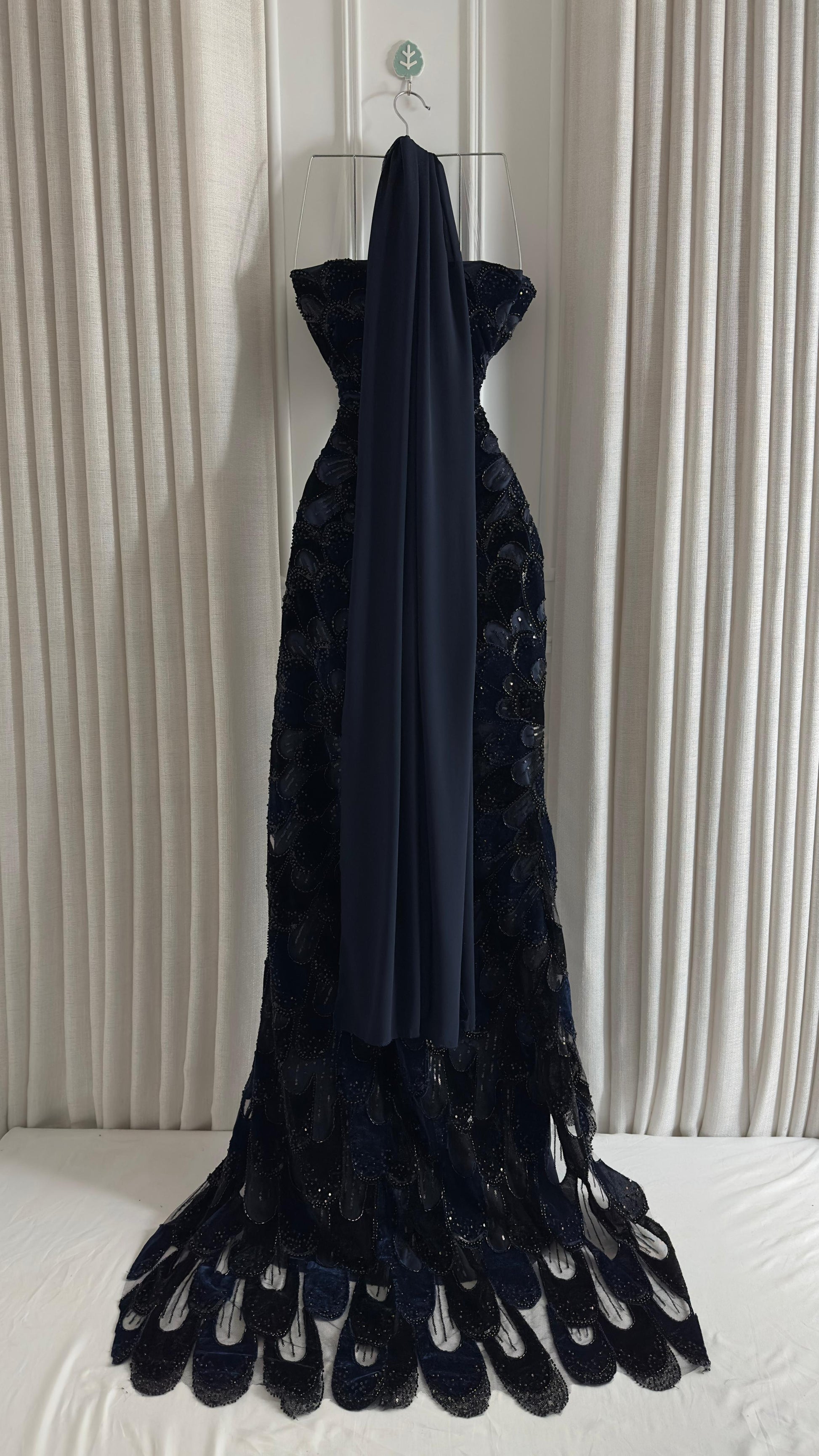 تألقي بإطلالة ساحرة وخيالية مع هذا الفستان الأزرق الداكن الفاخر. تصميمه الفريد يجمع بين الجمال والرقي، مما يجعله الخيار المثالي للمناسبات الخاصة والمواسم الاحتفالية.