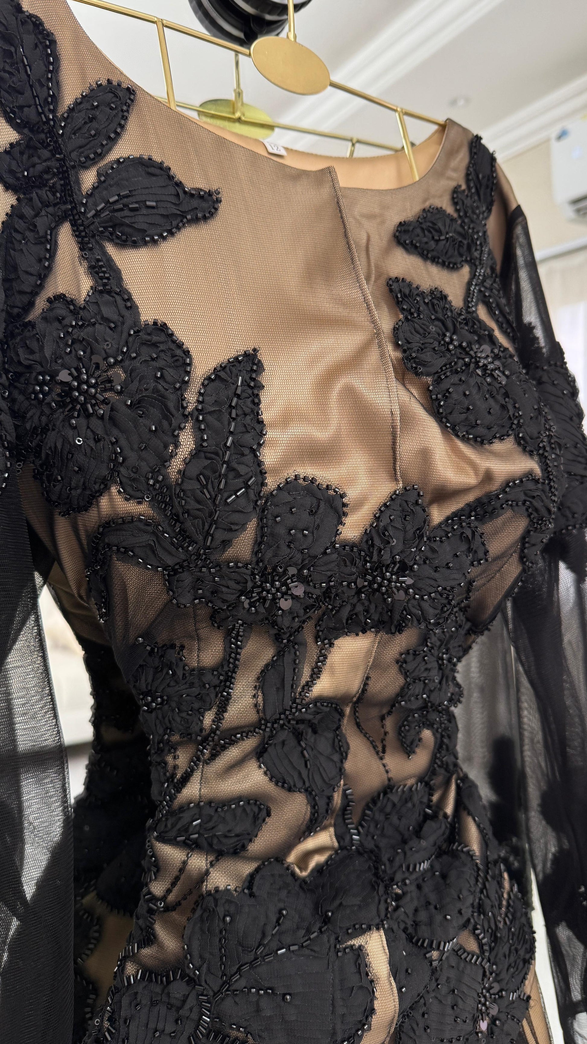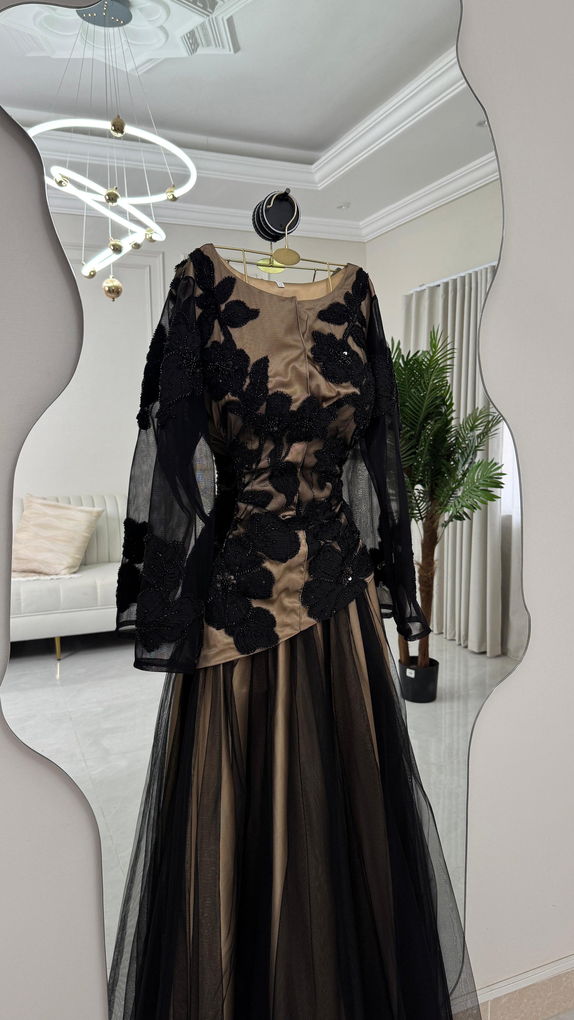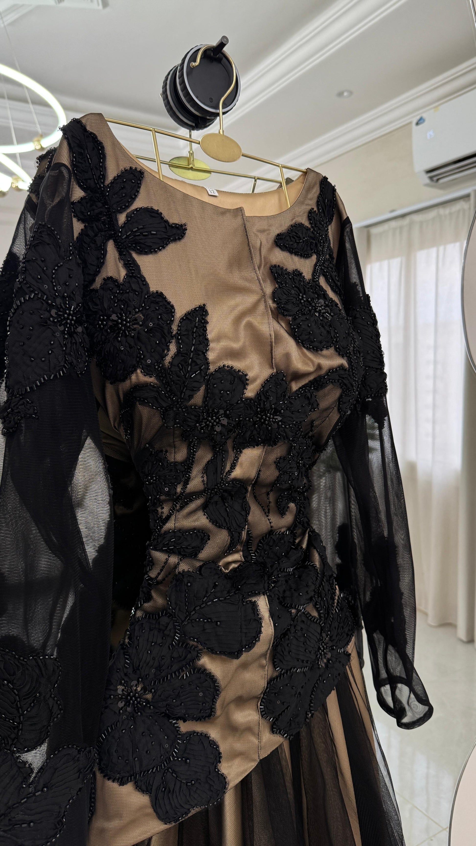 - **تأثير الطبقات:** القاعدة تتكون من طبقات من التول الأسود، مما يمنح الفستان مظهراً غنياً وبراقاً.