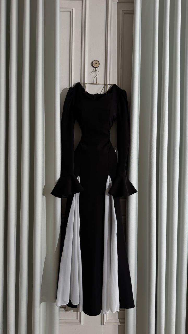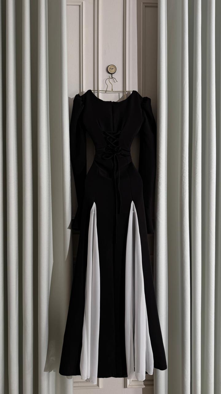 هذا الفستان يمزج بين الأناقة العصرية والتصميم المبتكر، مما يجعله خيارًا مثاليًا للمناسبات الأنيقة.