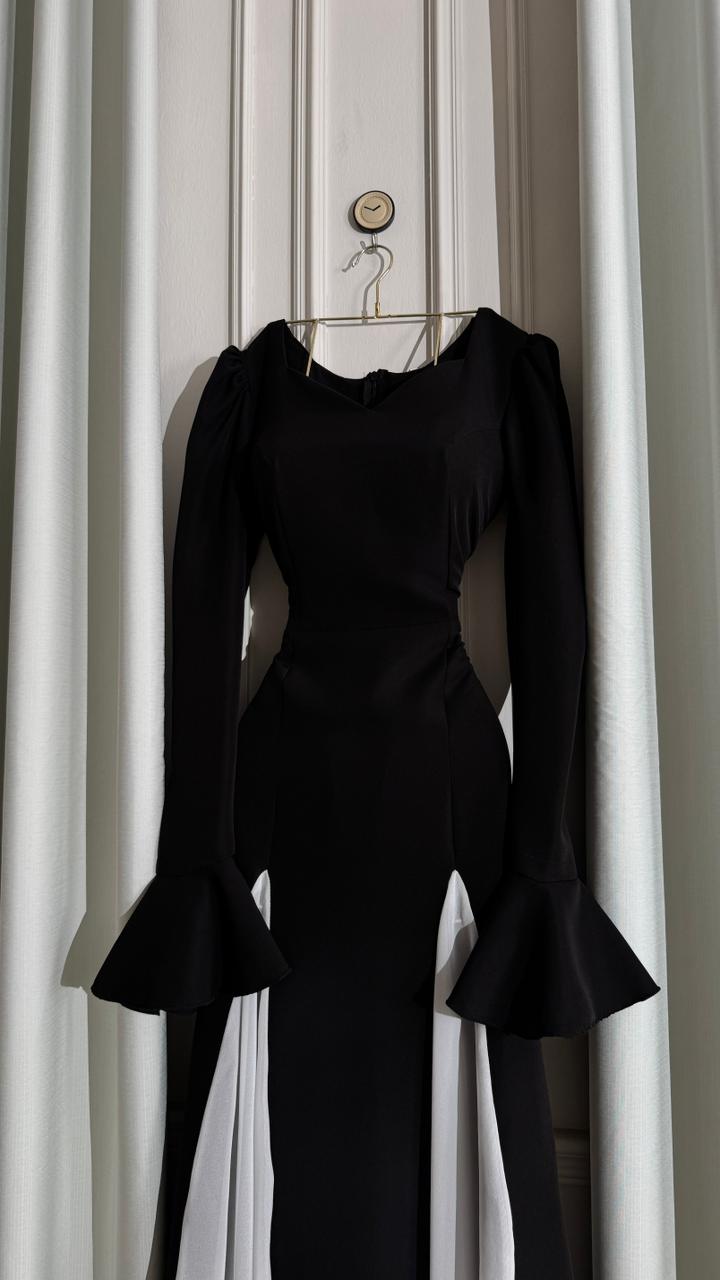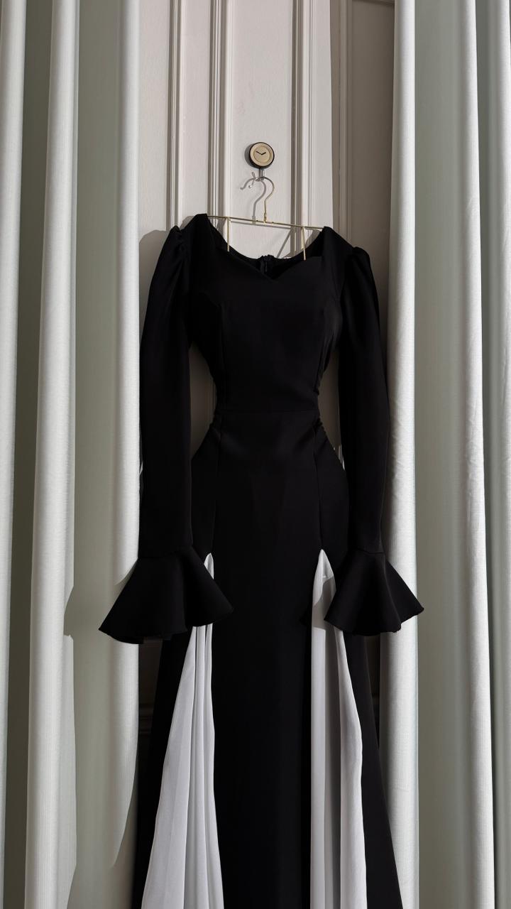 - **فستان طويل باللون الأسود:** يتميز بقصة رائعة تتضمن تفاصيل مميزة.